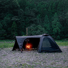 「ロイス ST」はテントに前幕をつけて広々リビングが拡張できる2WAY仕様の煙突穴付きテント。