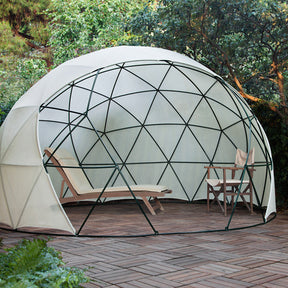 多面体のラインを組み合わせたドーム型フォルムと透明感クリアカバー(TPU素材※)の美しいガーデンコテージです。