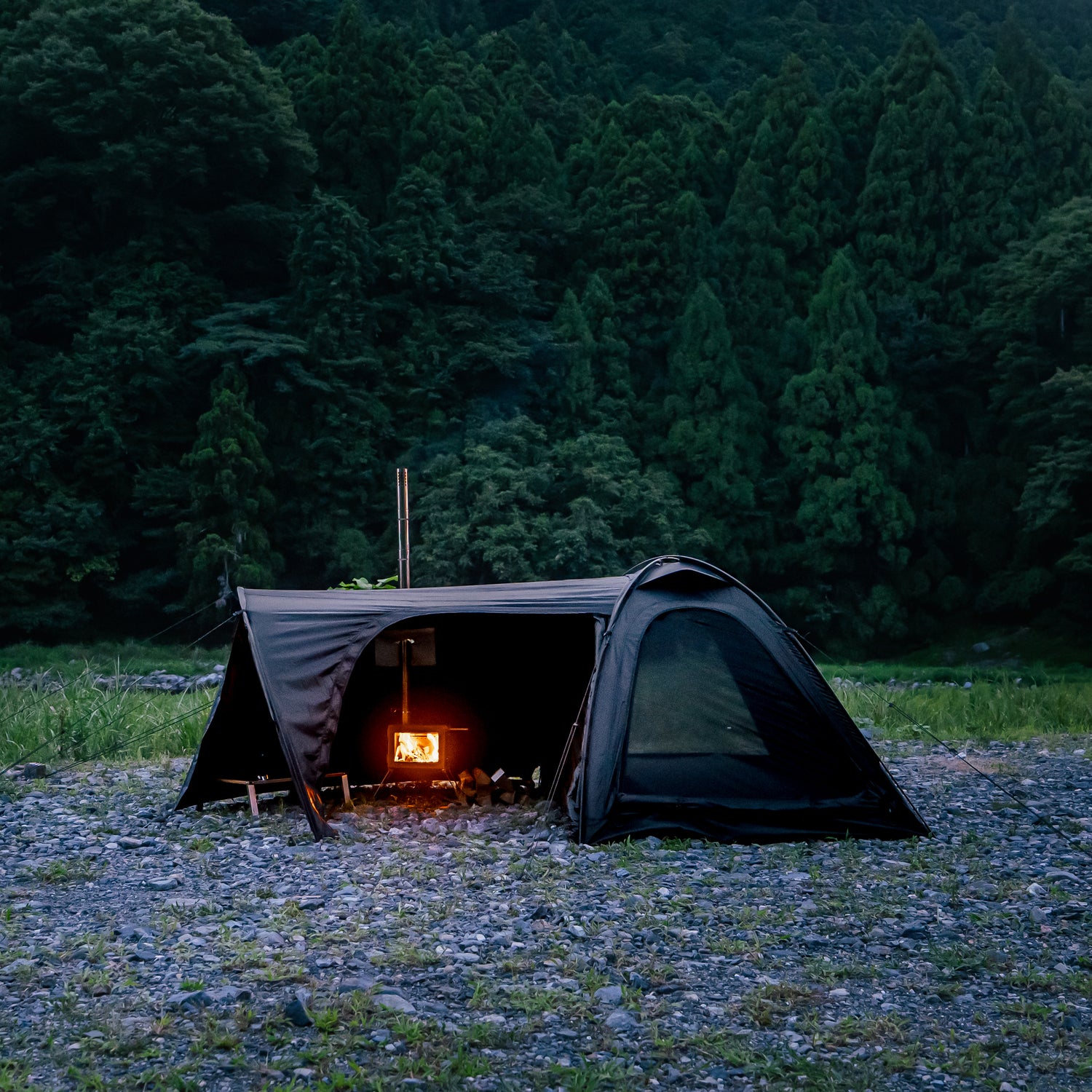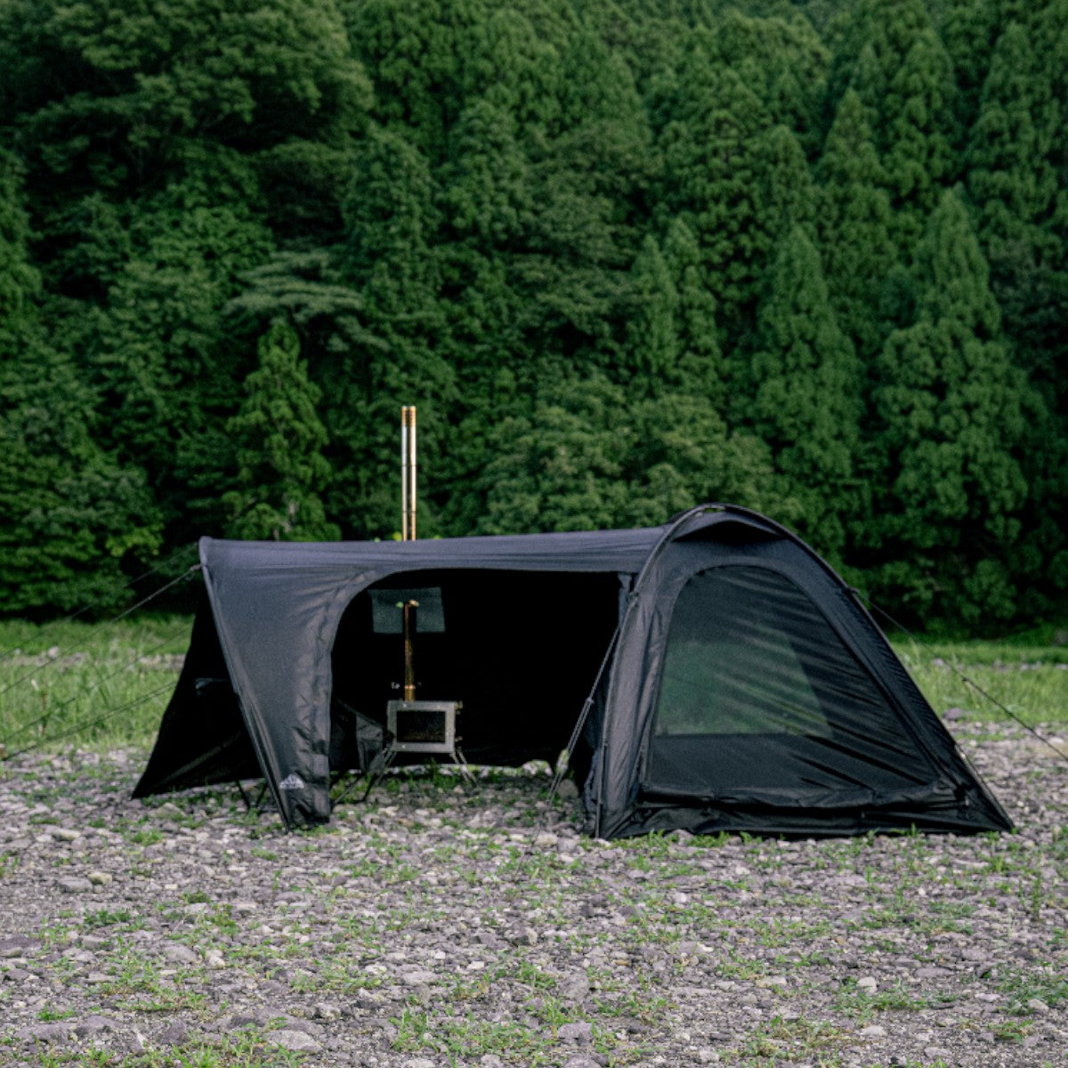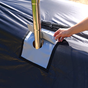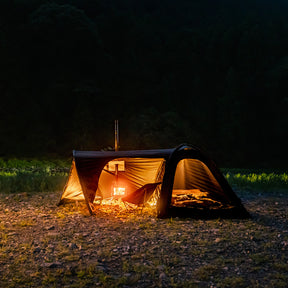 テント内で薪ストーブをご使用の際は、前面パネルと左側入口を開放し、自己責任のもと安全にご使用ください。