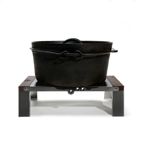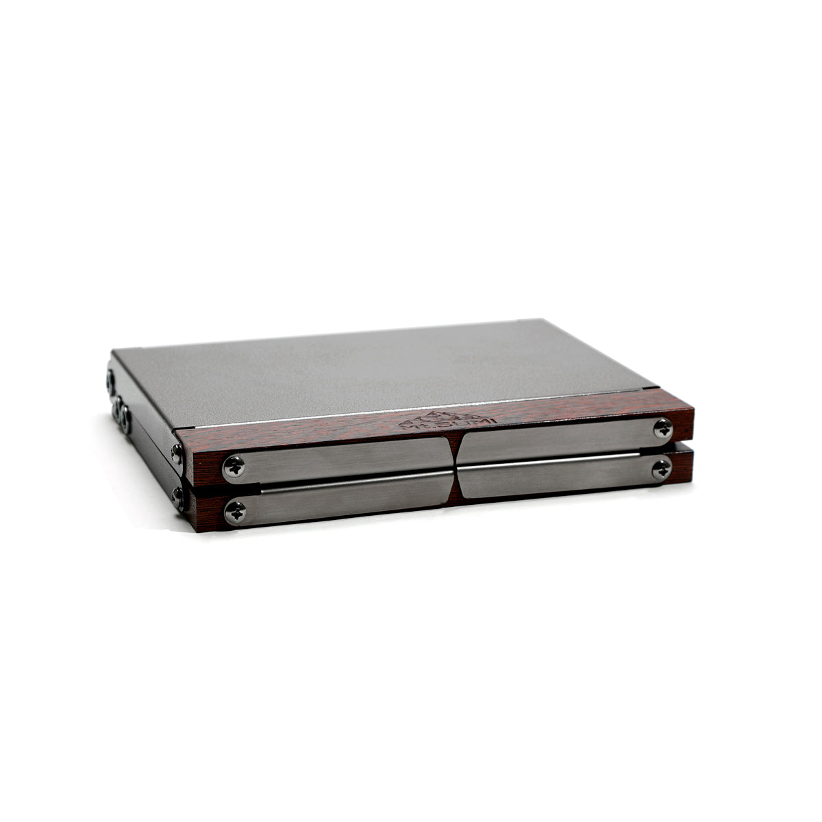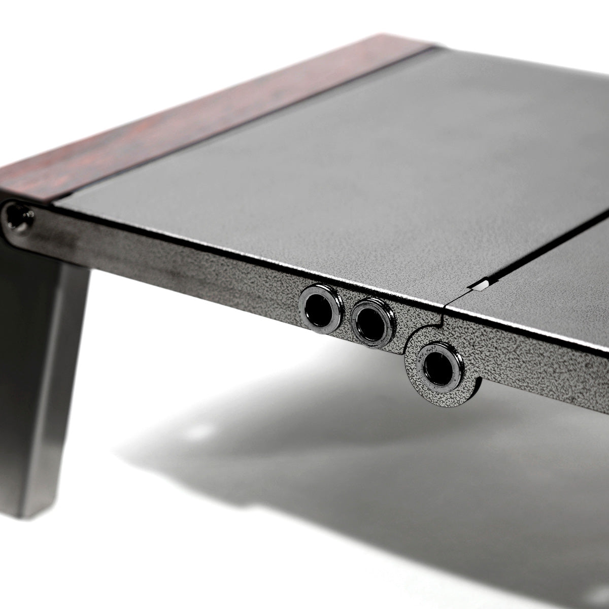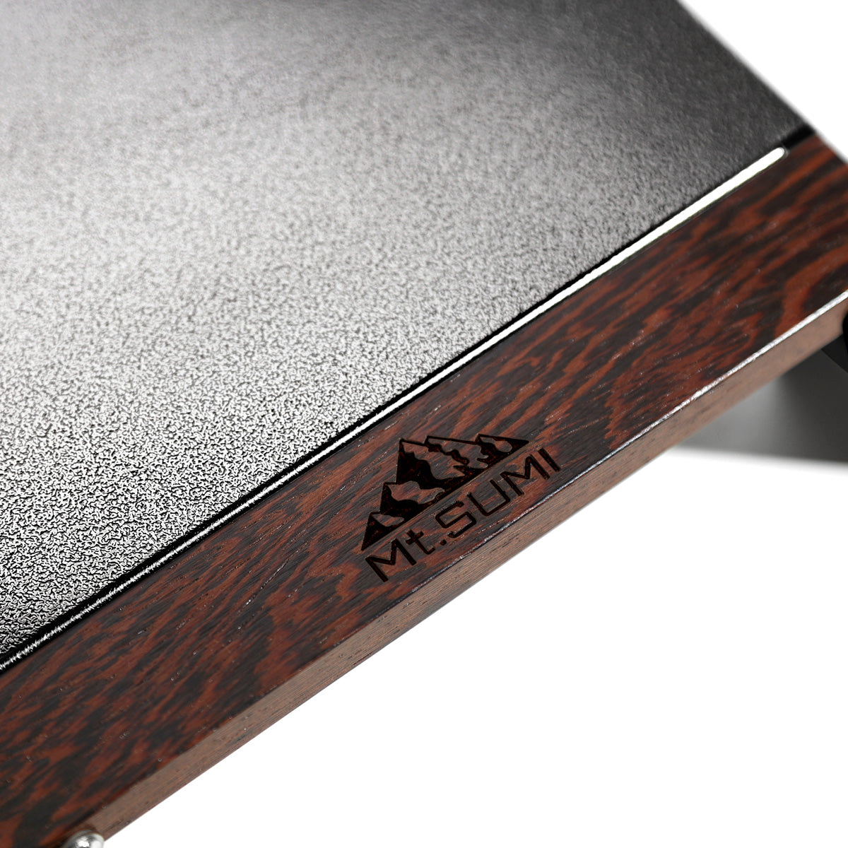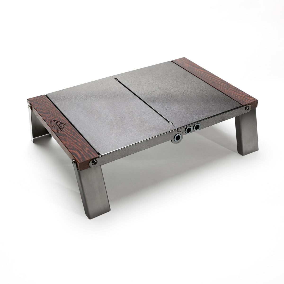 ステンレスを天板と脚に採用し、焚き火などのそばでも使える仕様。ウッド部分には黒い色調と木目が特徴的なウェンジ材、金属にはクロムメッキを施すことで重厚感を演出します。
