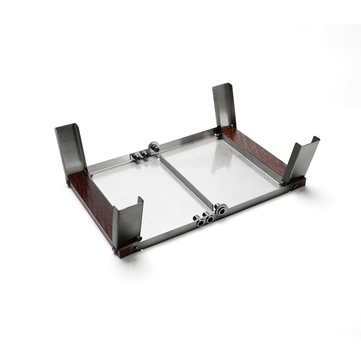 エンボス加工を施したステンレスをクロムメッキで仕上げた天板と、ウッド部分は硬さのあるウェンジ材を使用することで細かい傷や汚れにも強い仕様。